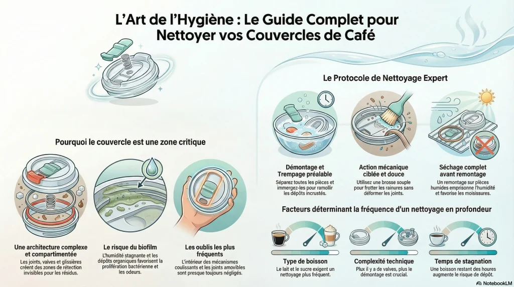 Lors d’un lavage rapide, de nombreuses zones d’accumulation sont systématiquement négligées : les joints, les petites pièces amovibles, l’intérieur des mécanismes coulissants et toutes les zones où l’humidité a tendance à stagner. Or, ce sont précisément ces endroits qui retiennent les dépôts de café, de lait, de sucre ou d’arômes, favorisant ainsi les odeurs persistantes et l’apparition d’un biofilm. En pratique, un couvercle mal démonté ou mal séché sera presque toujours plus problématique qu’une tasse simplement mal rincée.