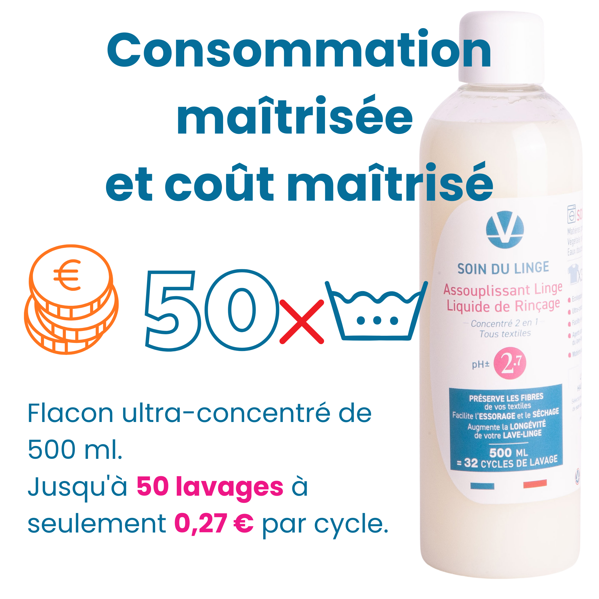 Cela montre que le Liquide Rinçage Ecologique Linge N°2.7 est non seulement écologique et efficace mais aussi économique à l’usage, offrant un excellent rapport qualité-prix pour le soin quotidien de votre linge.