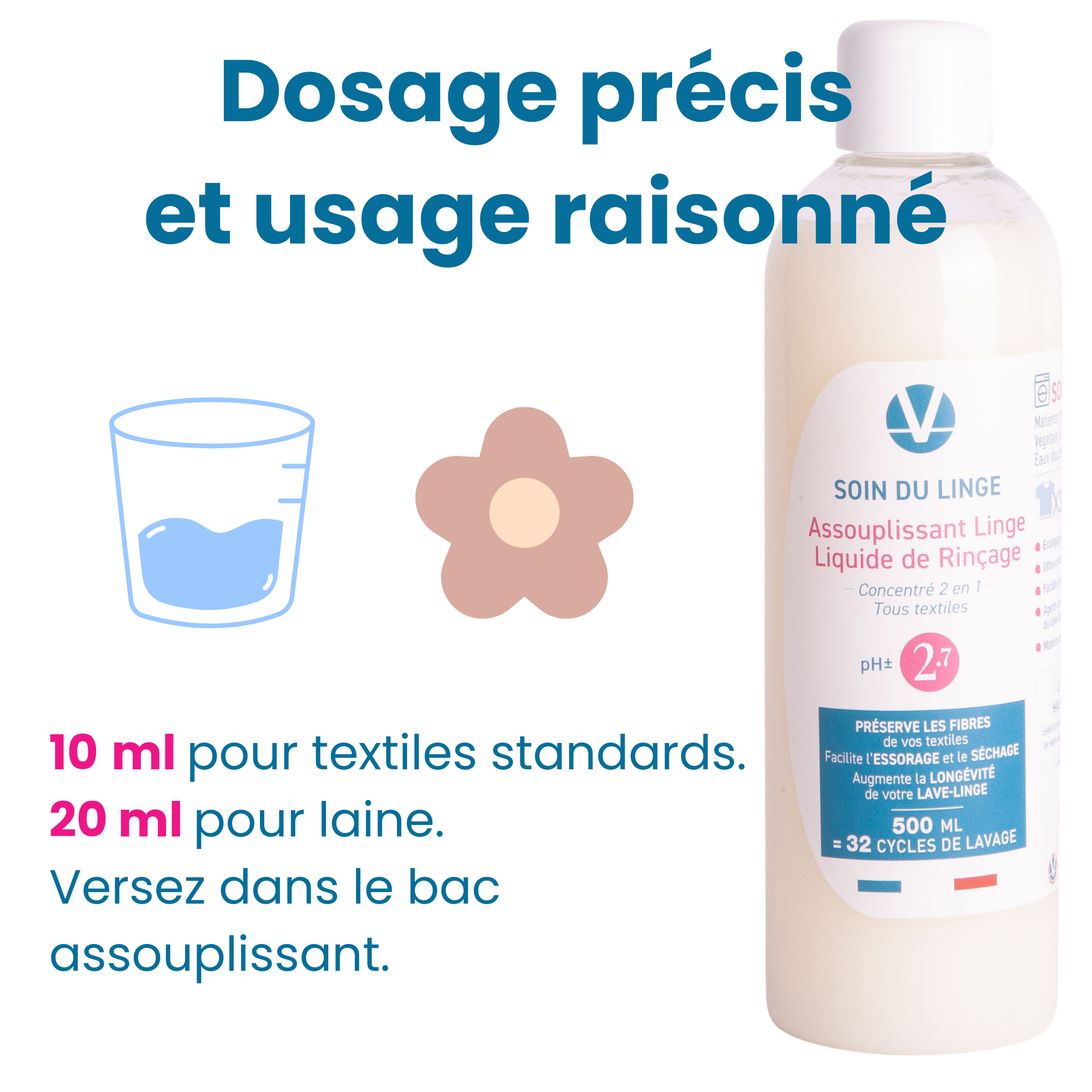Pour Textiles Standards : utilisez 10 ml d’assouplissant pour chaque cycle de lavage, adapté pour la majorité des textiles.