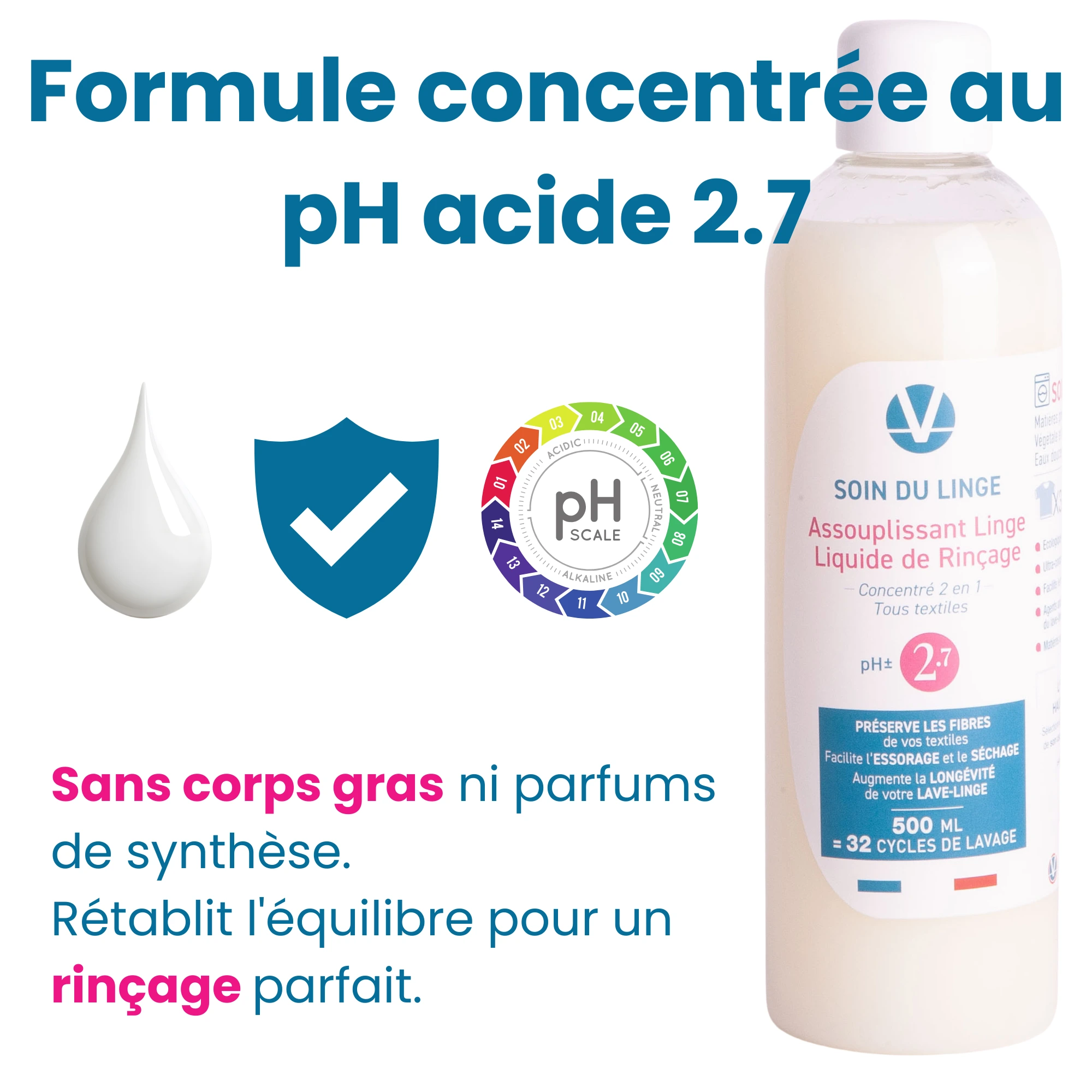 pH Acide : formulé spécialement pour le soin du linge sans agresser les tissus.