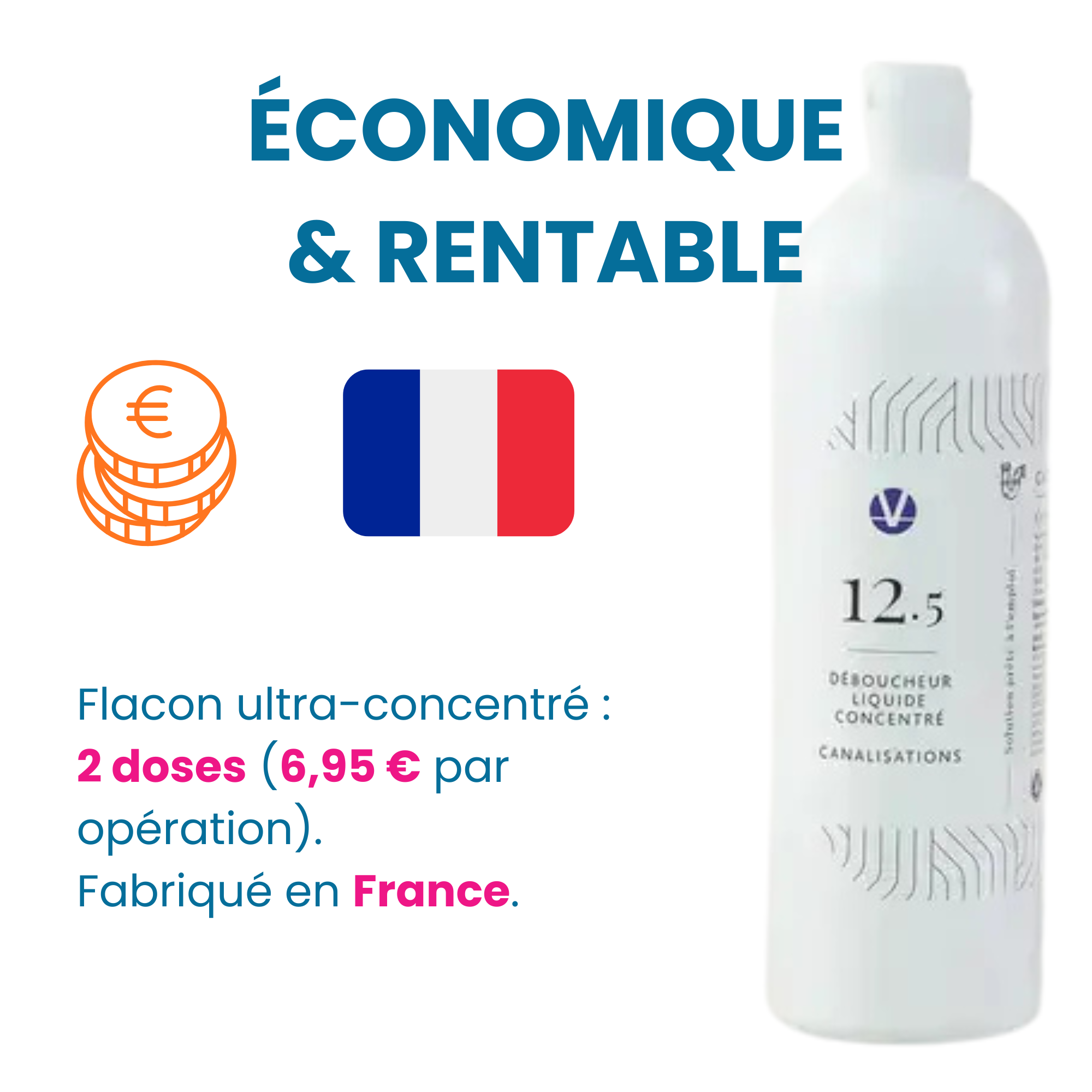 Pour un Débouchage Léger à Modéré : si vous utilisez environ 250 ml (la moitié du flacon) pour traiter une obstruction légère à modérée, le coût par opération est de 6,95 €.