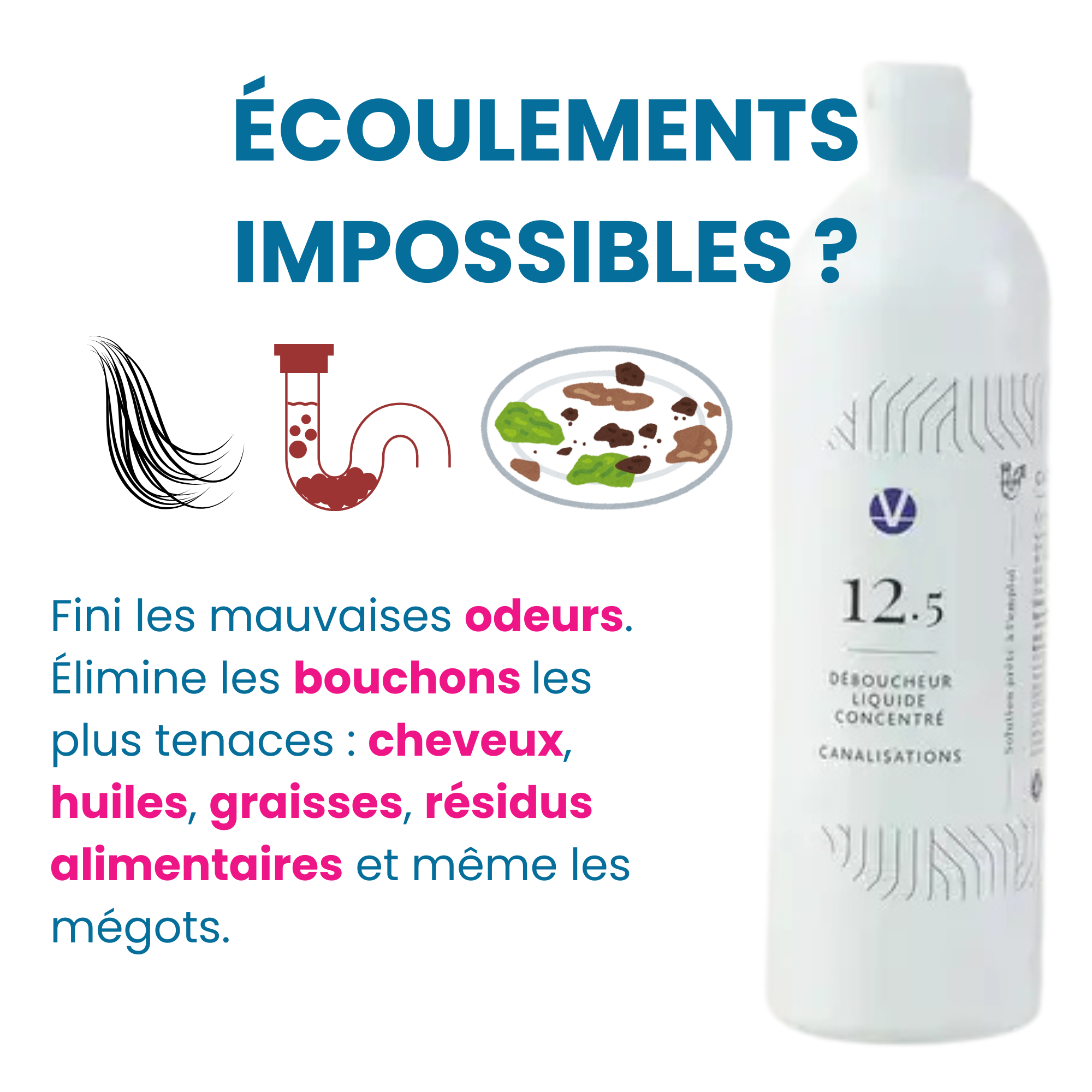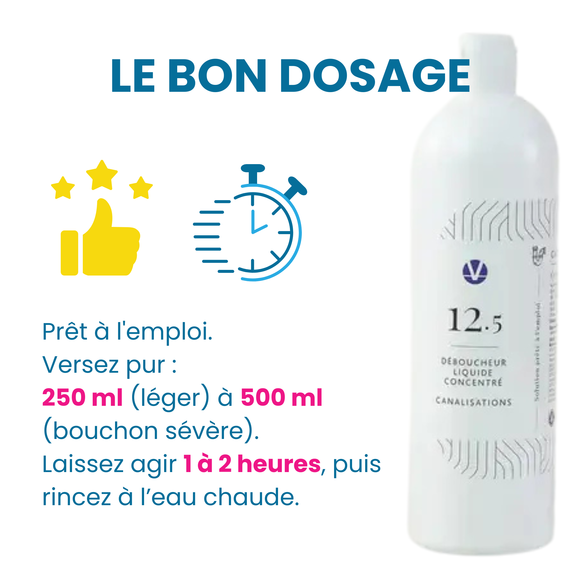 La quantité de Déboucheur Surpuissant Canalisations N°12.5 nécessaire dépend de l’importance de l’obstruction. Commencez toujours par une petite quantité et ajustez selon les besoins.