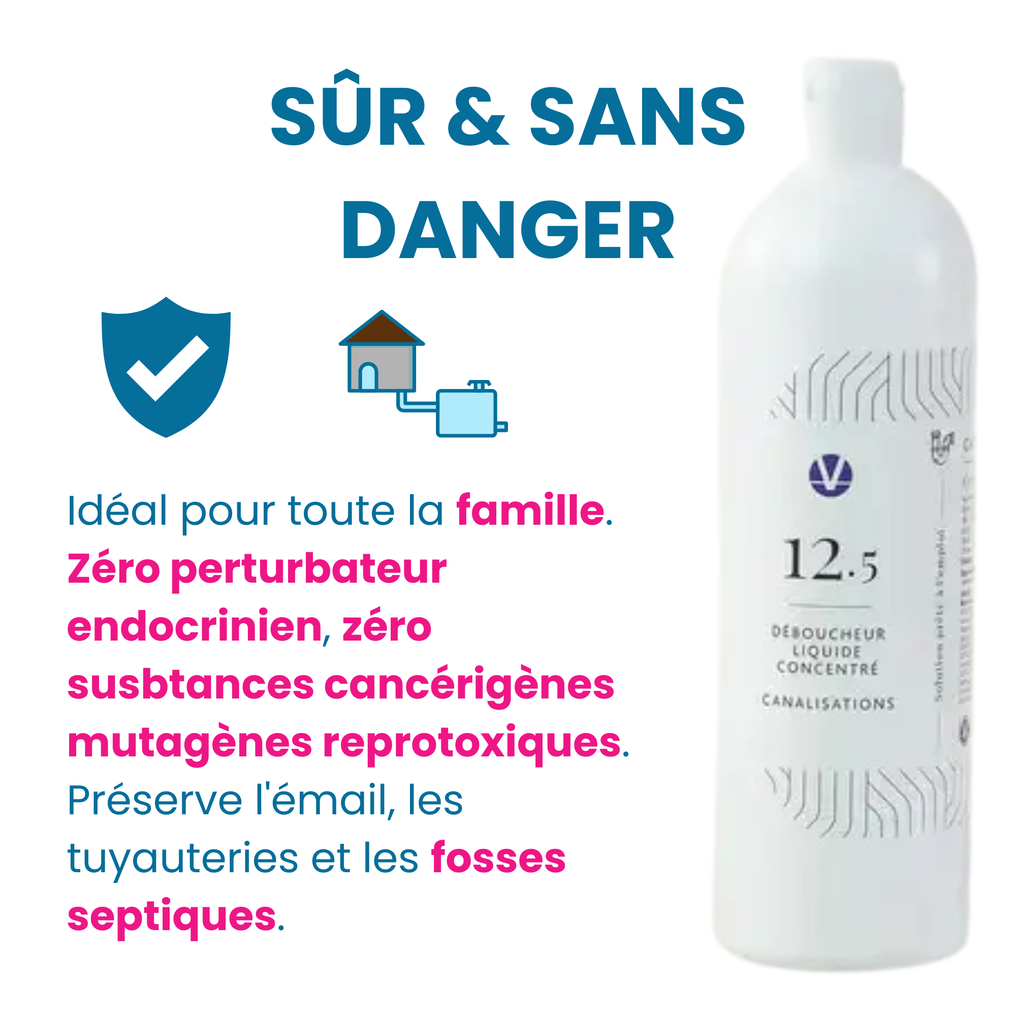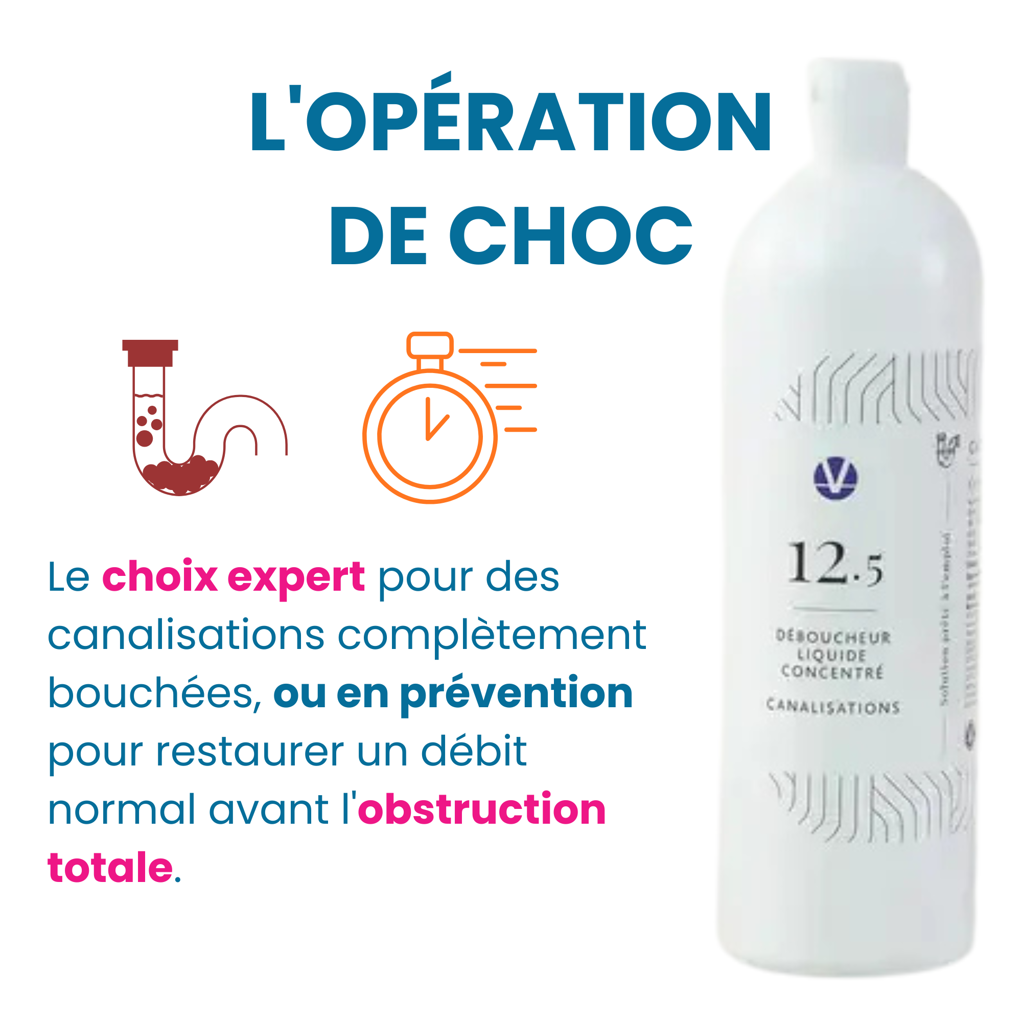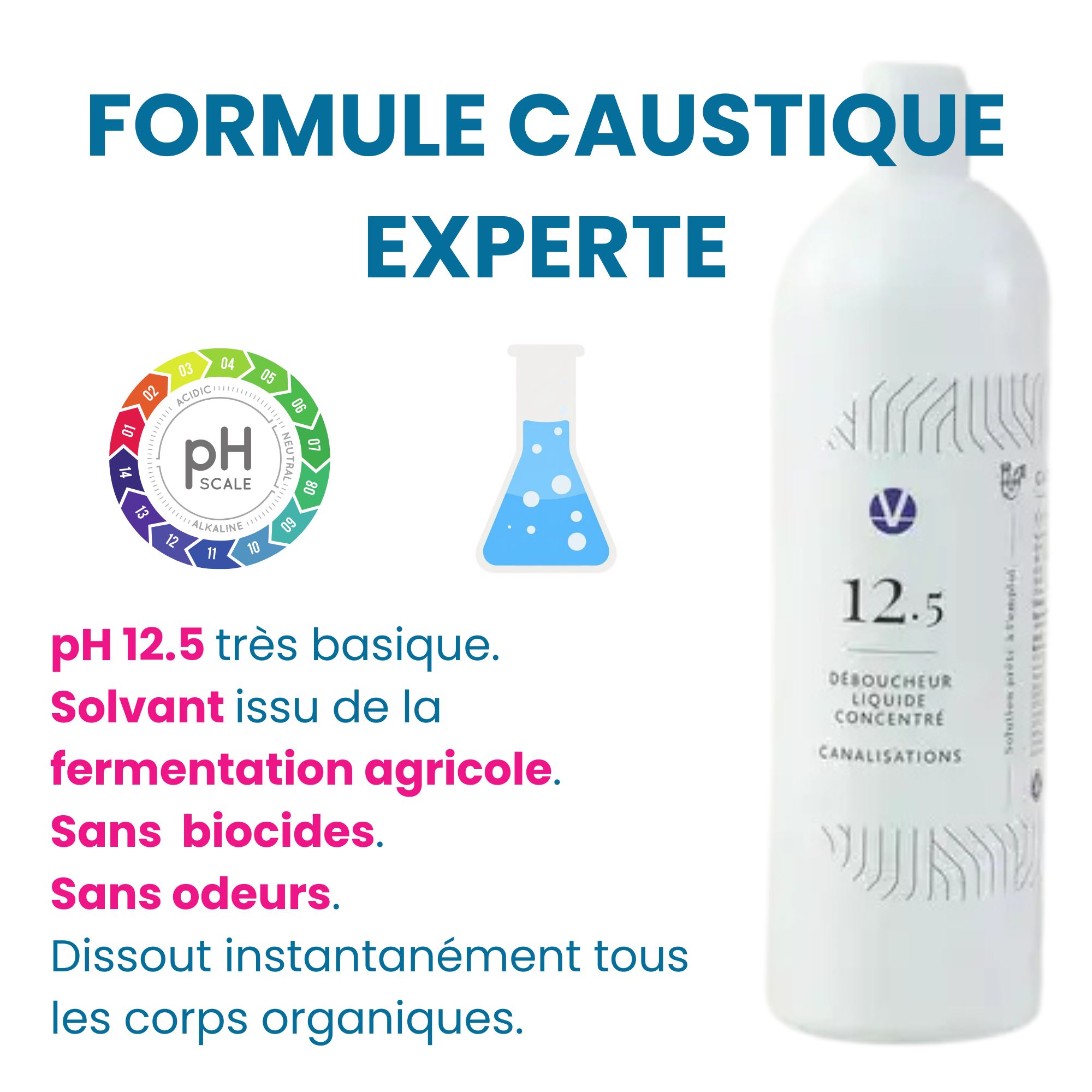 Notre Déboucheur Surpuissant Canalisations N°12.5 est un liquide ultraconcentré caustique qui contient des agents spécifiques permettant de désintégrer les obstructions.