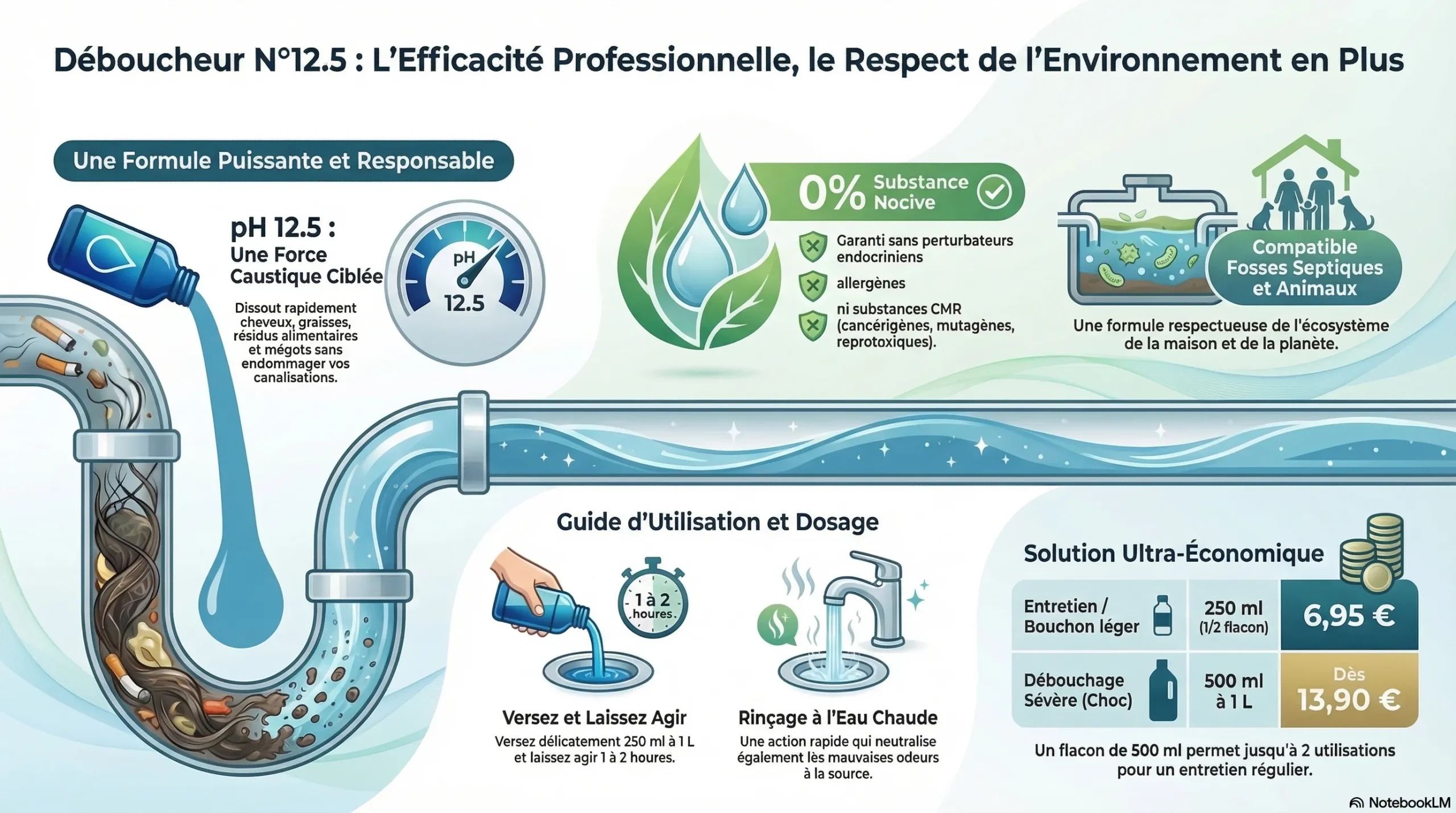 Puissance de la Formule : je me suis assurée que notre déboucheur élimine rapidement les blocages organiques tout en neutralisant les odeurs à la source.
