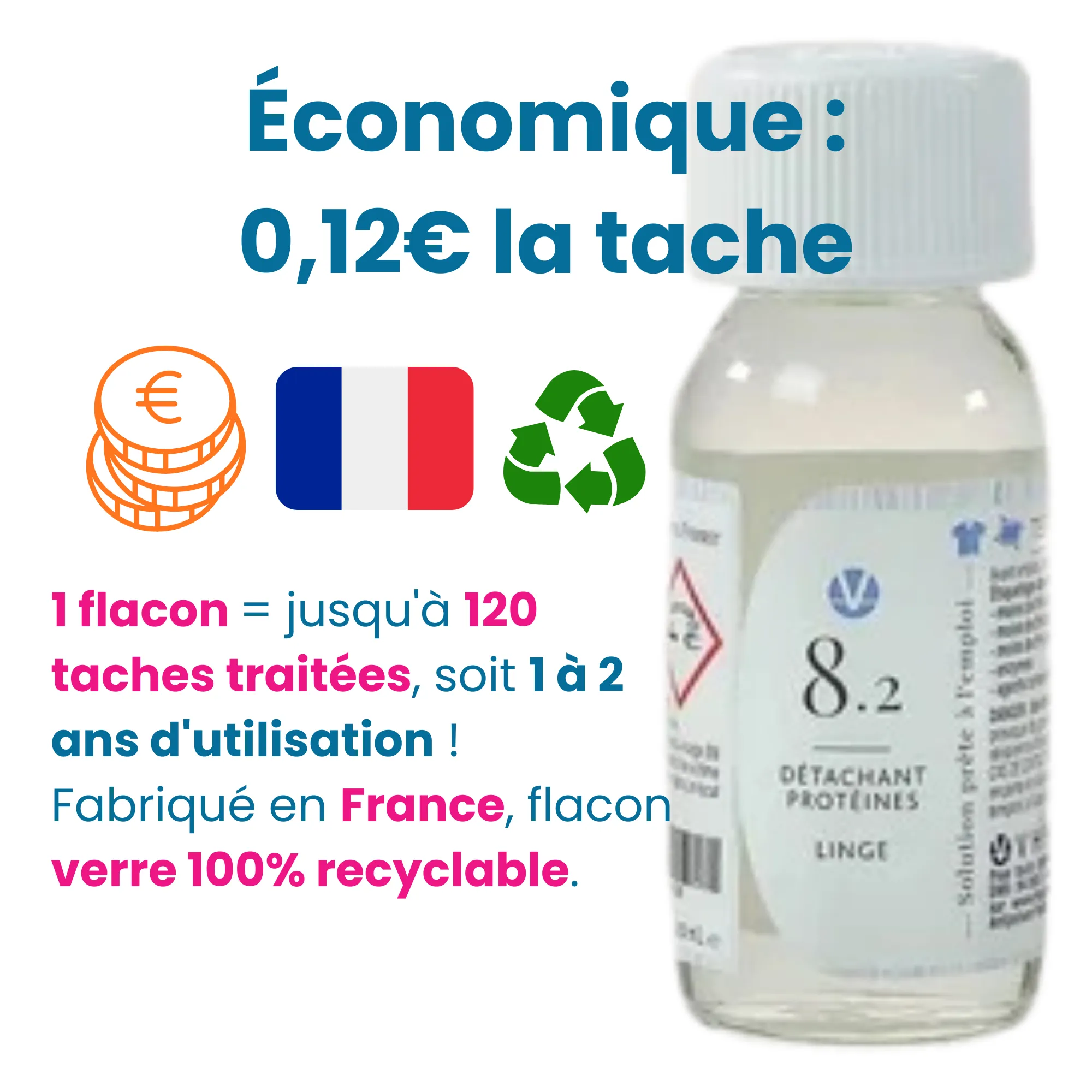 Utilisation Directe : si vous appliquez le détachant vêtements directement sur les taches sans dilution, considérons qu’une petite quantité d’environ 0.5 ml est nécessaire par tache. Dans ce cas, un flacon vous permettrait de traiter jusqu’à 120 taches. Cela revient à environ 0,12 € par tache.