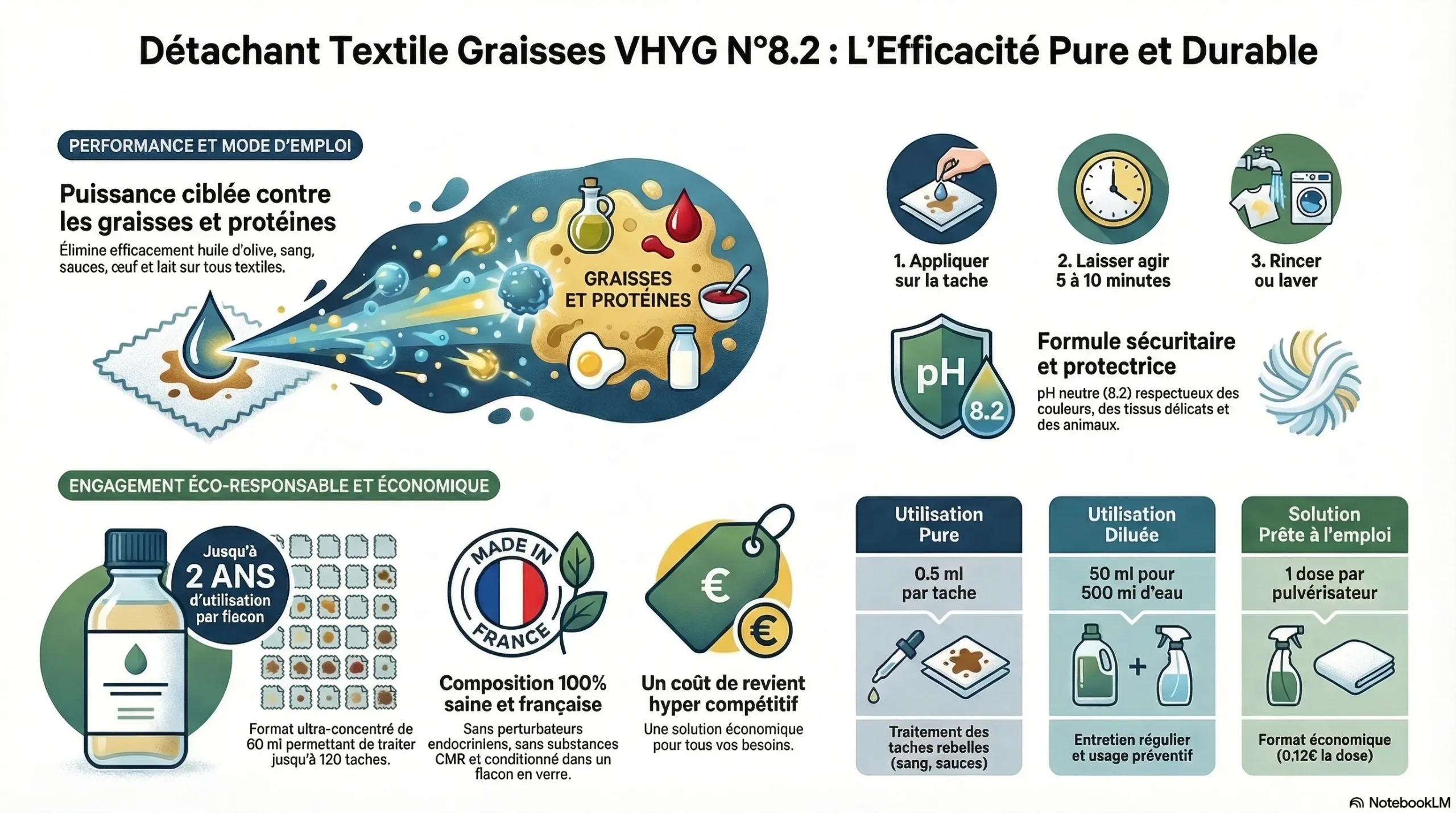 LeDétachant graisses écologique textiles N°8.2 illustre parfaitement la quête de VHYG pour harmoniser efficacité de nettoyage et engagement environnemental. Voici comment ce détachant vêtements se distingue dans sa démarche écoresponsable :