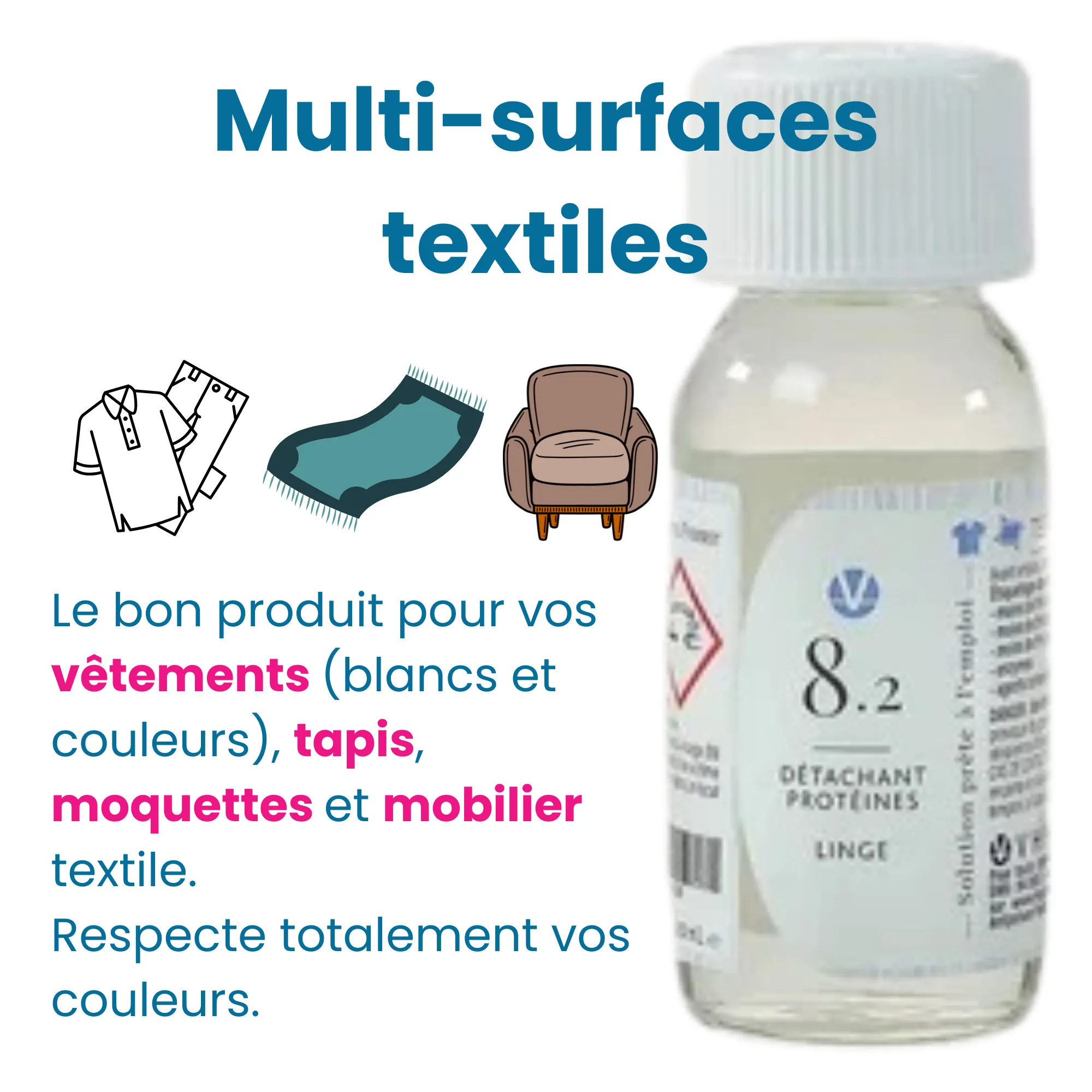 Il respecte votre linge et peut s’utiliser sur tous vos vêtements, blancs ou couleurs. Vous pouvez aussi appliquer notre détachant vêtements graisse N°8.2 sur les tapis, moquettes, ou tous types de mobilier textile.