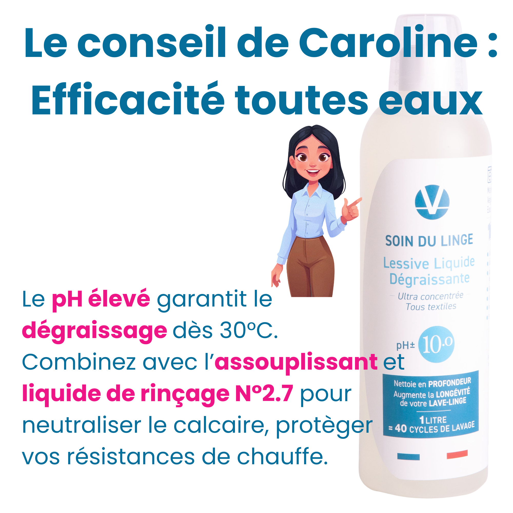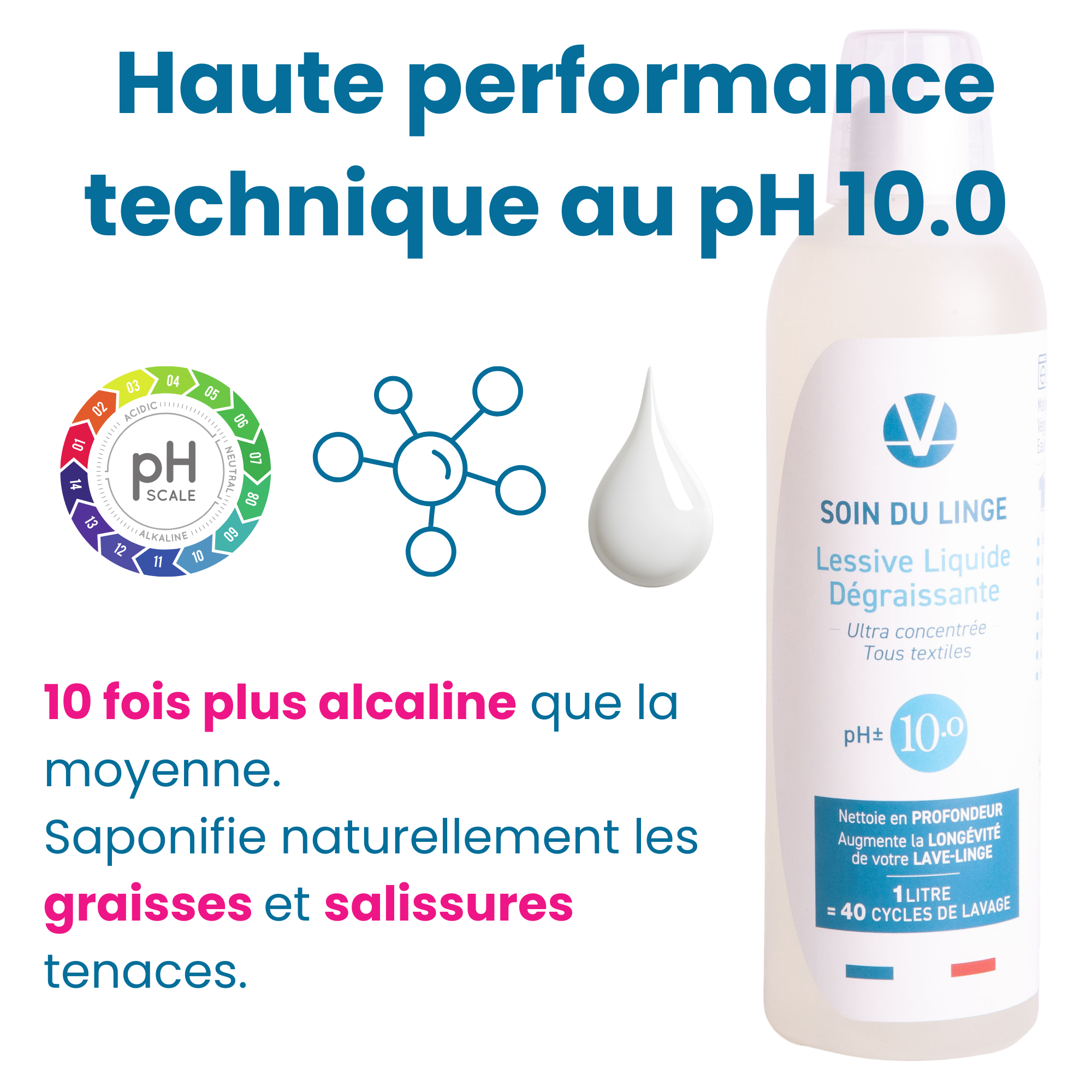 Pouvoir Nettoyant et Dégraissant Élevé : grâce à son pH basique de 9.5 à 10.5, cette lessive dissout efficacement les saletés et les graisses, assurant un linge impeccablement propre.