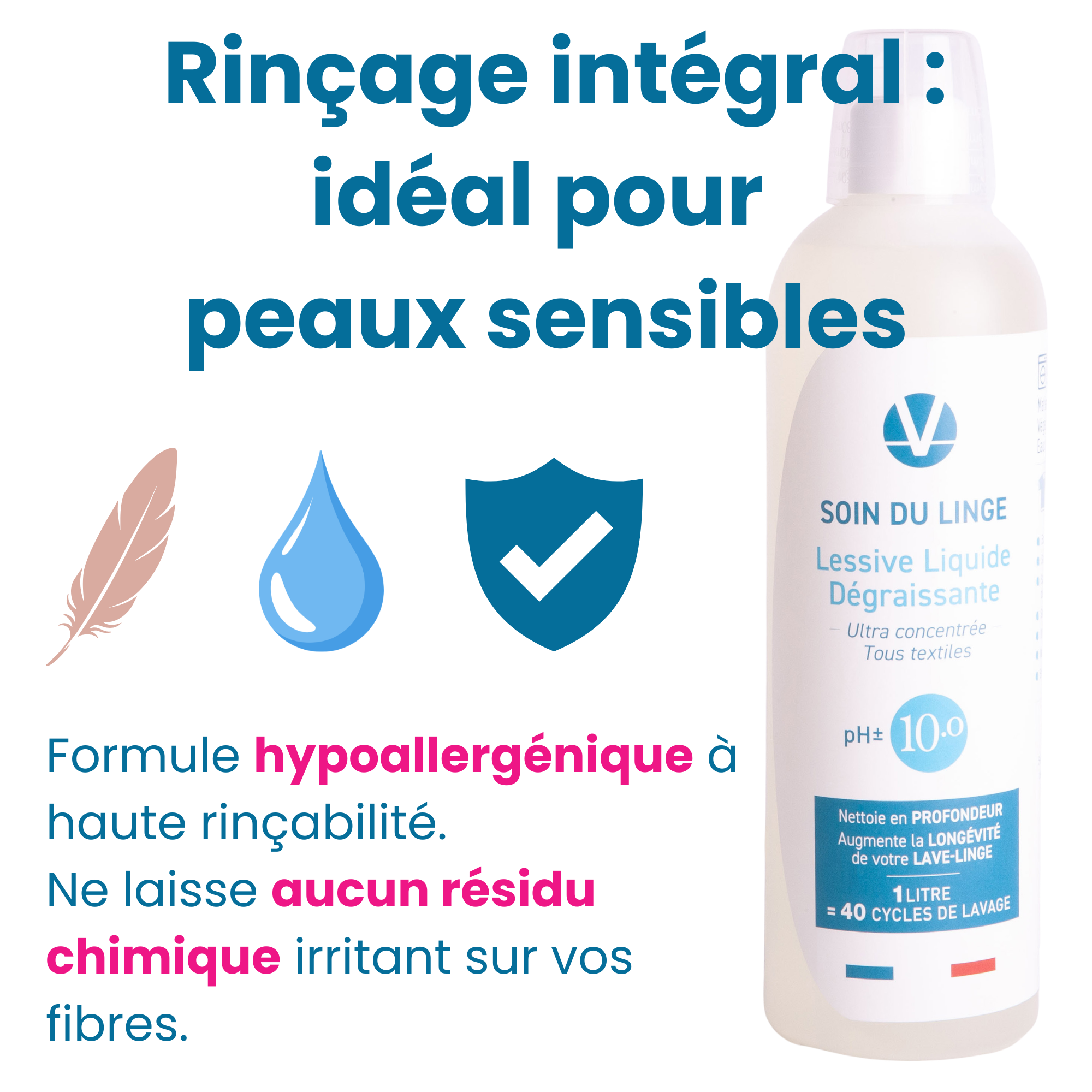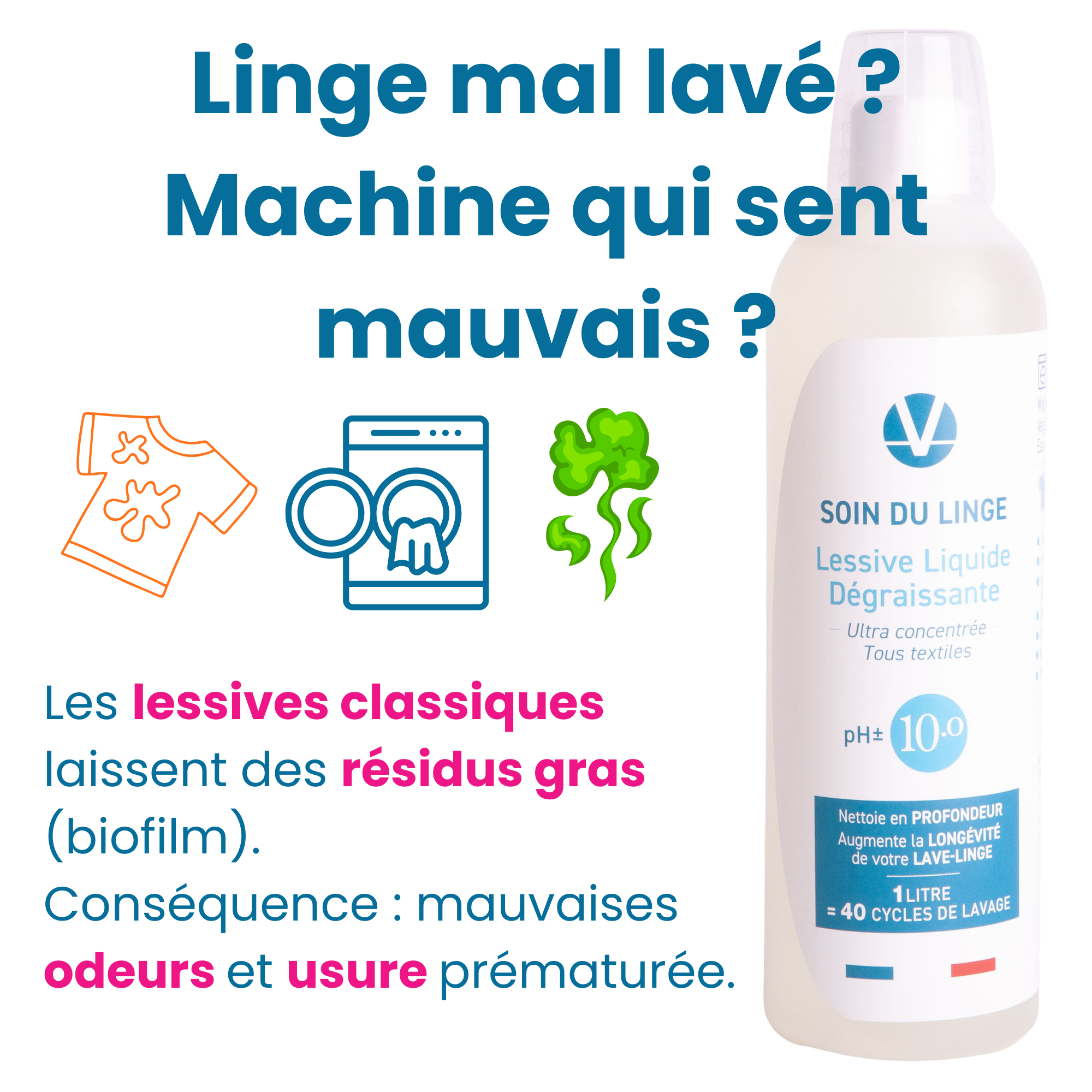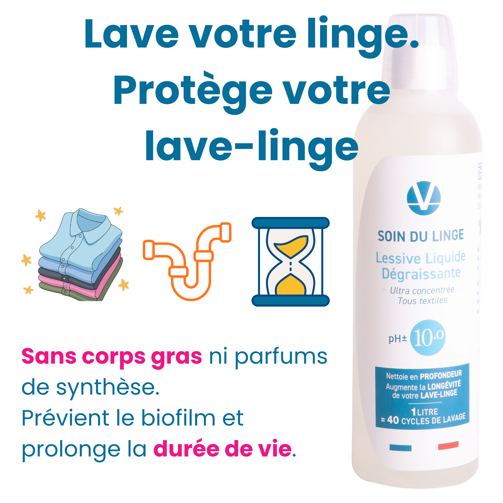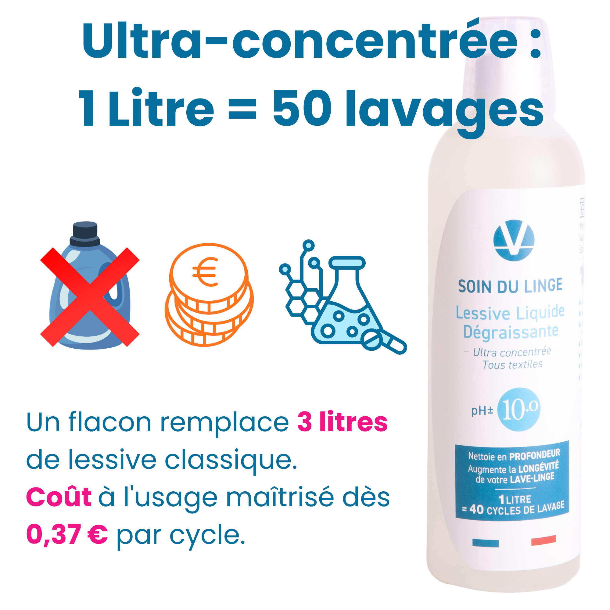 Ultra-Concentration pour une Utilisation Économique : son ultra-concentration permet un usage très économique, nécessitant seulement 15 à 25 ml par cycle de lavage. Un flacon de 1L couvre jusqu’à 50 cycles, optimisant votre budget et réduisant le besoin en emballages.