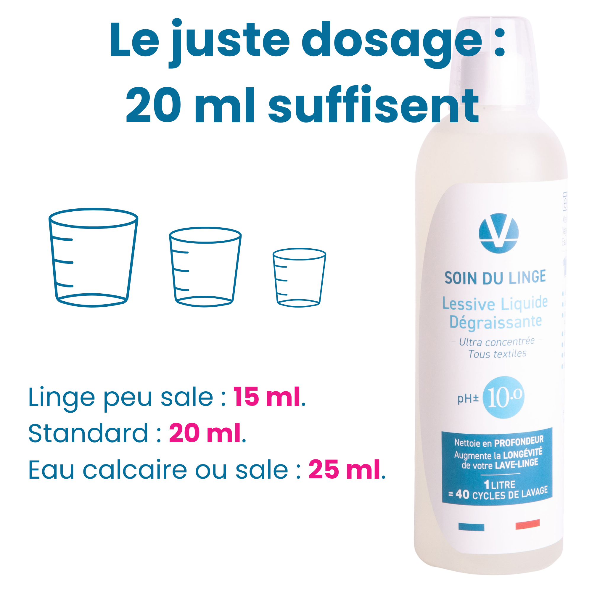 Dosage pour Salissure Normale : pour une salissure moyenne, dosez 20 ml de lessive.