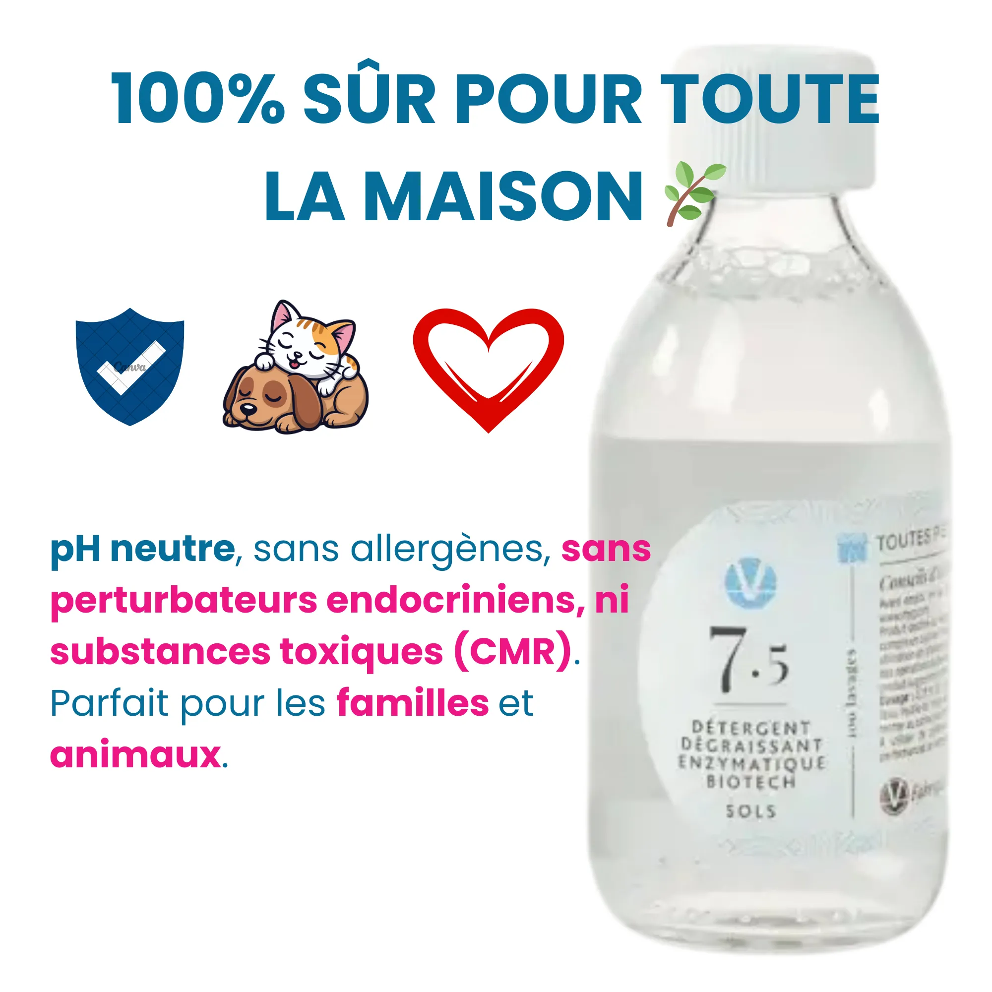 La sécurité de nos amis à quatre pattes est essentielle. Le Nettoyant Enzymatique Sols N°7.5, grâce à son pH neutre et à sa composition non toxique, élimine les odeurs indésirables tout en restant totalement sûr pour les animaux domestiques. C’est le choix parfait pour ceux qui veulent maintenir leur foyer propre et sûr pour tous ses occupants.
