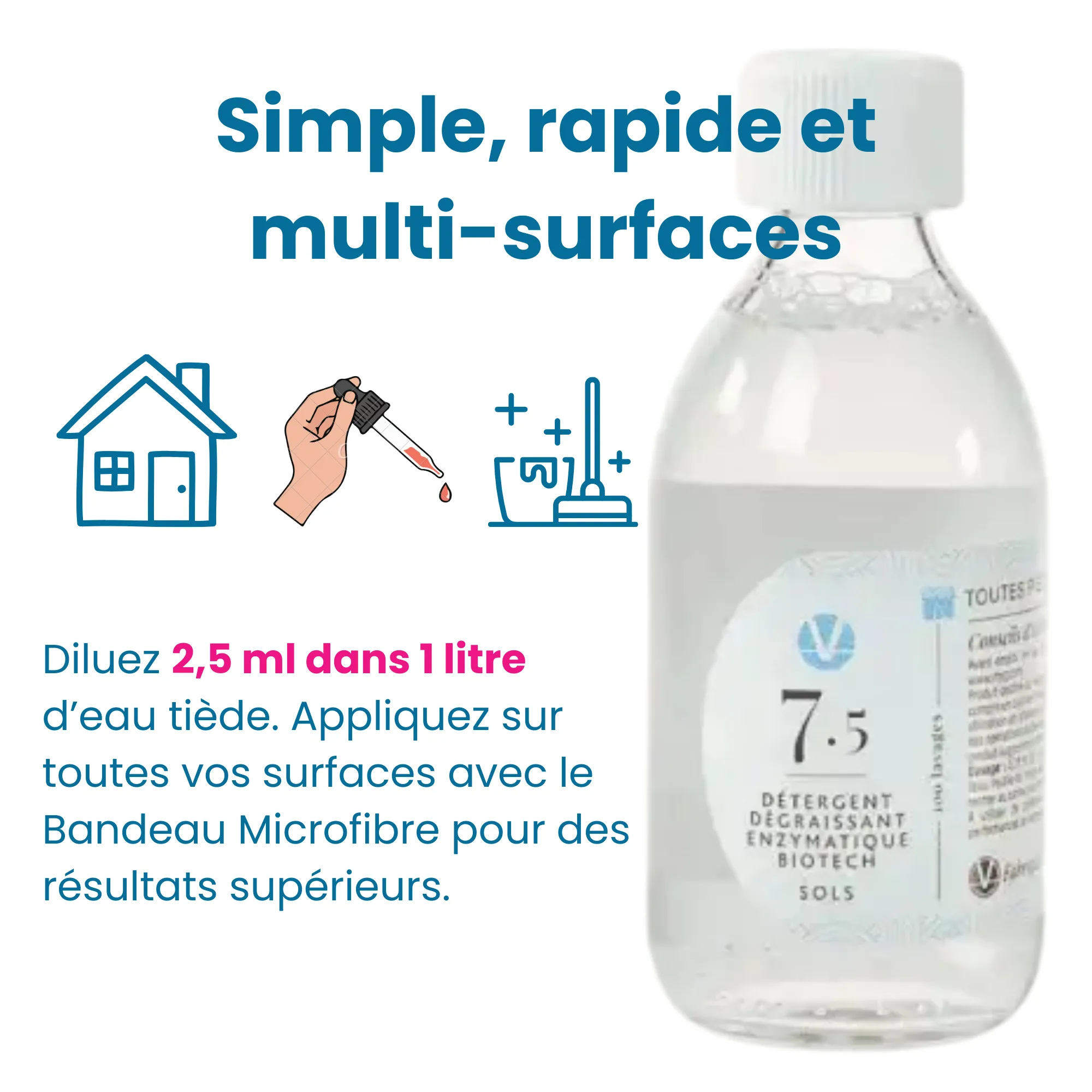 Oubliez les vieilles méthodes de nettoyage fastidieuses et inefficaces. Avec le Nettoyant Enzymatique Sols N°7.5, adoptez une approche plus intelligente et plus écologique. Au lieu de réutiliser constamment un seau d’eau qui devient rapidement sale, je vous conseille d’utiliser plusieurs Bandeaux Microfibre Sol 240, pré-trempés dans notre solution diluée. Cette méthode vous assure un nettoyage efficace sans gaspillage d’eau ou de produit ménager.