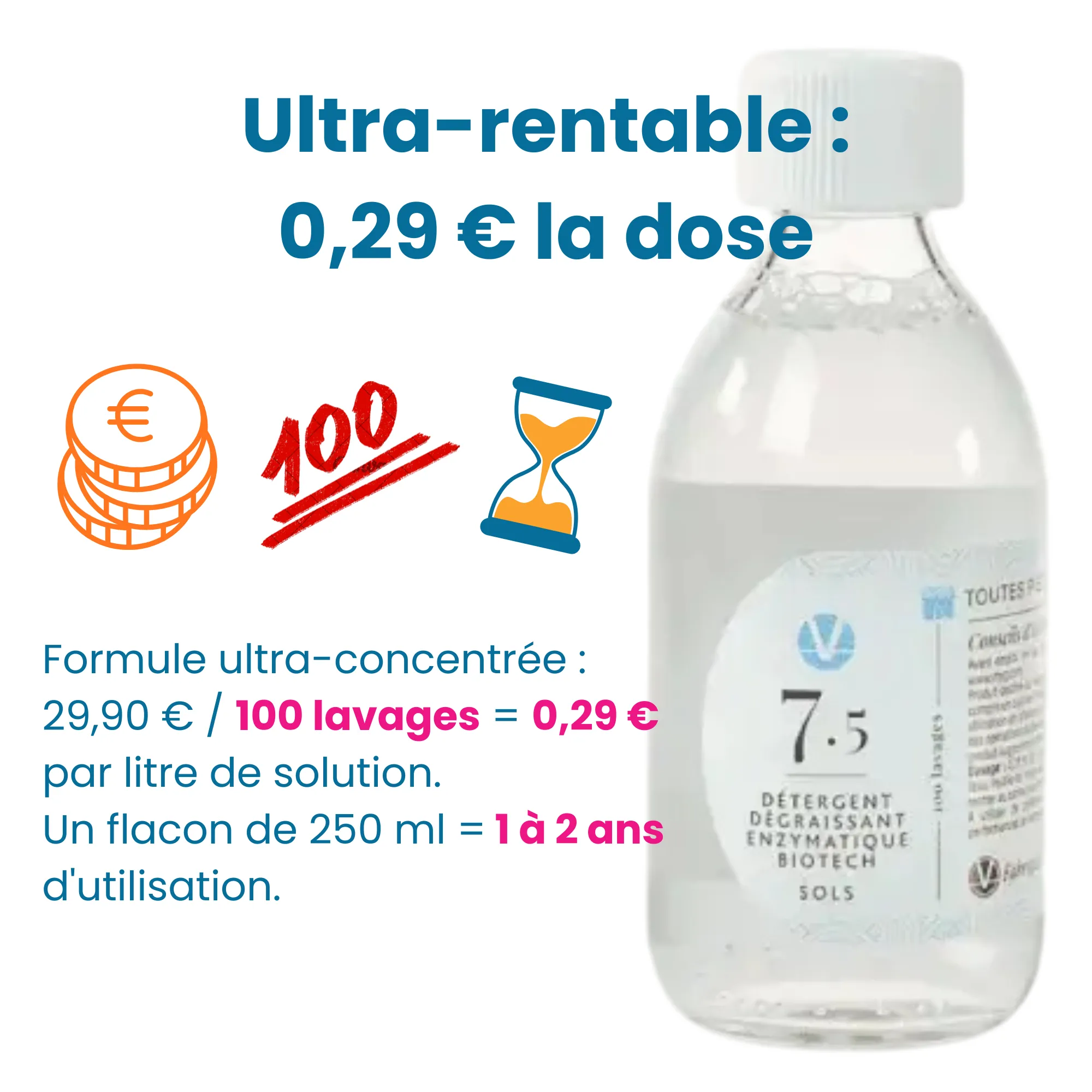 Ce coût par litre de solution de nettoyage démontre non seulement l’efficacité du NETTOYANT ENZYMATIQUE SOLS N°7.5 mais aussi son caractère économique, permettant une utilisation durable tout en préservant la qualité et la propreté de vos sols.