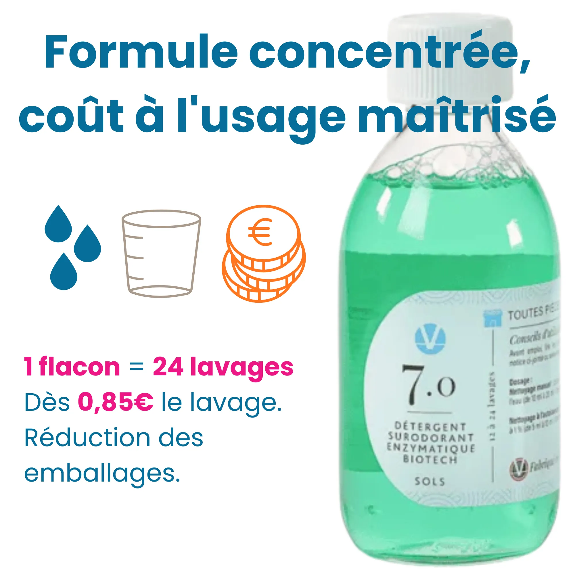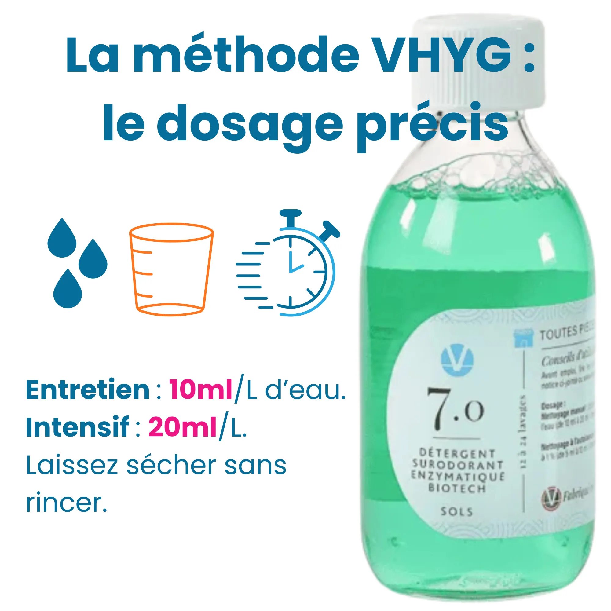 Personnalisez votre Dilution : ajustez la concentration du Nettoyant N°7.0 en fonction de l’état de vos sols. Cela maximise son action tout en étant conscient de notre empreinte écologique.