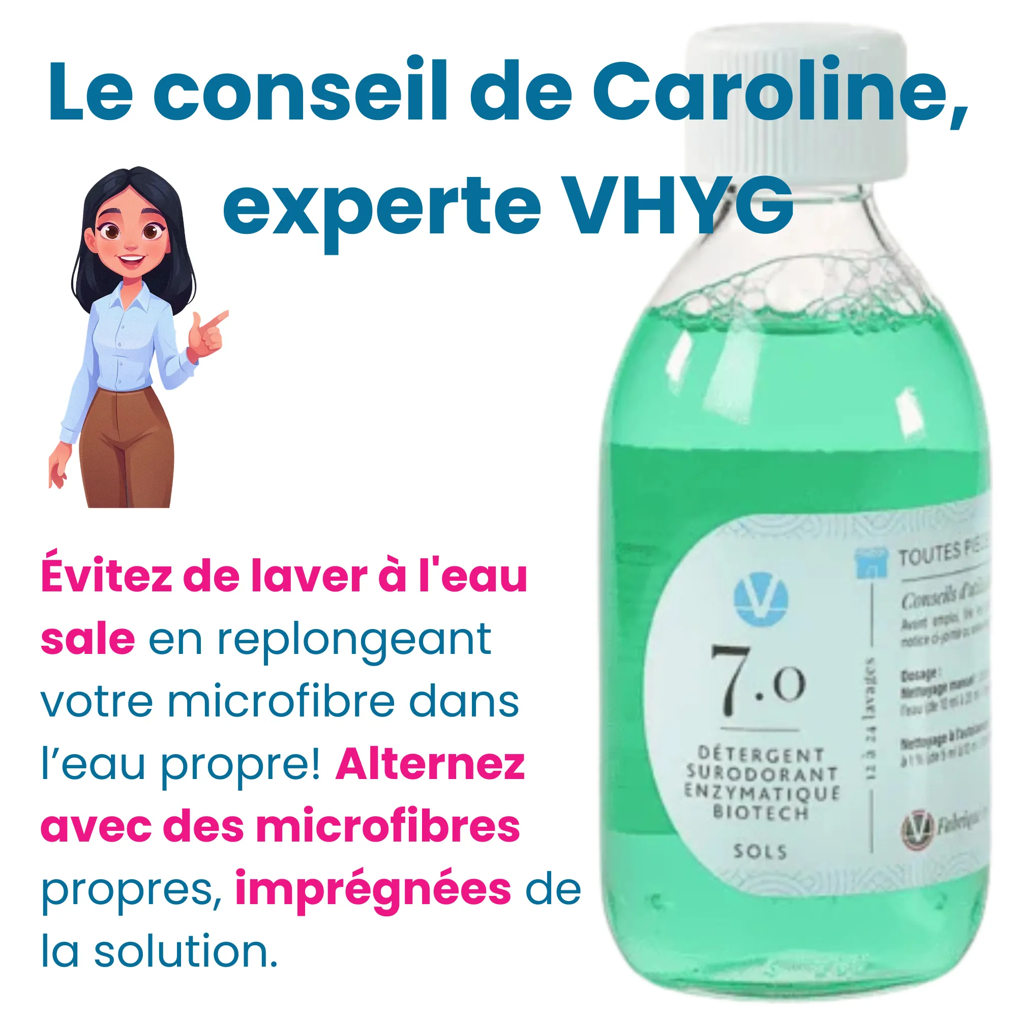 Préparation des Bandeaux Microfibres : commencez par diluer le Nettoyant enzymes sols odorant N°7.0 dans un seau avec un litre d’eau tiède. Trempez-y plusieurs bandeaux microfibres 240, préparant ainsi vos “munitions” de nettoyage.